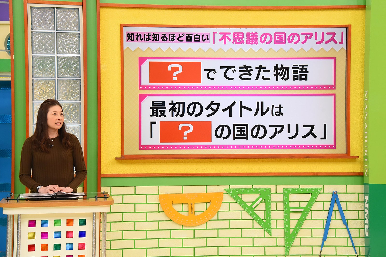 1時間目は、「不思議の国のアリス展」のプロデューサーである高見澤庸先生が、「不思議の国のアリス」についてレクチャー。もともとのタイトルは「不思議の国のアリス」ではなく「〇〇の国のアリス」。○○に入る言葉とは?NMB48のメンバーがクイズ形式で挑戦する。他にも、知れば知るほどおもしろいクイズが紹介される。