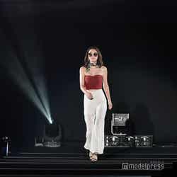 ブラウンのチューブトップ×レースのボトムにサングラス、スカーフを合わせた街リゾスタイルでランウェイに登場。くっきりとした谷間と、輝く美肌をのぞかせて会場の視線を独占した。ステージトップでは、サングラスを外してキュートな微笑み。クールなウォーキングとのギャップで魅了した。