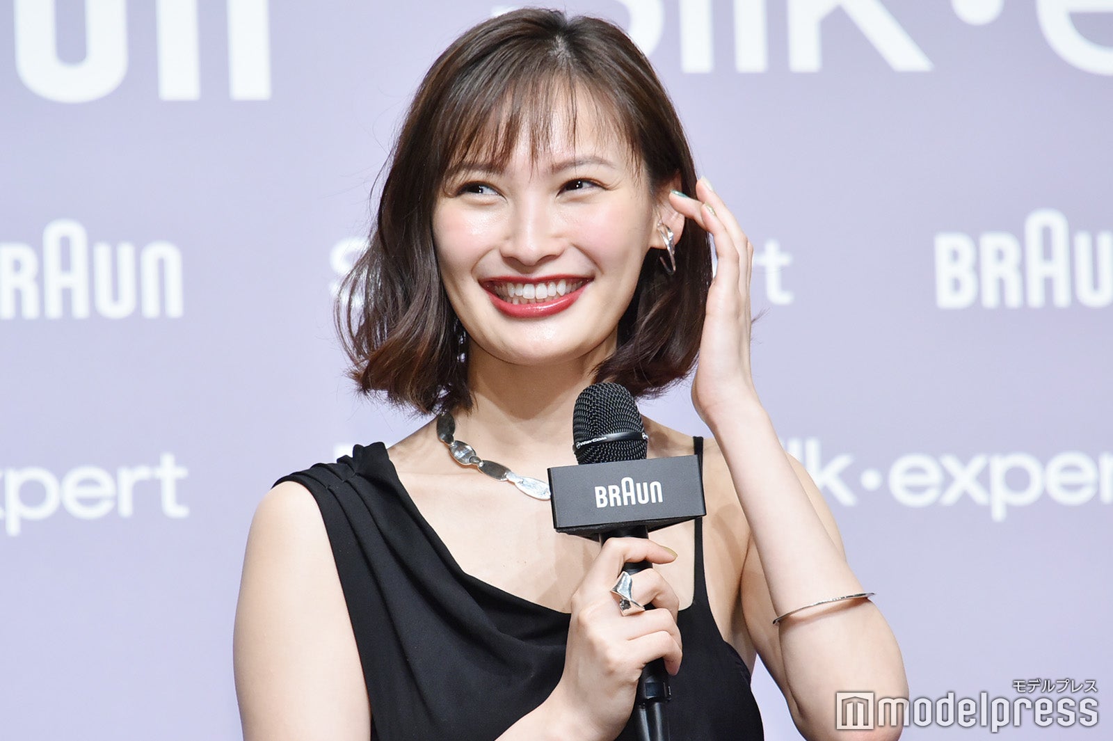 美肌の秘訣を聞かれると「食事は自炊でバランスよく作る。夜は糖質をオフにしたり、調味料を使わなかったり。ジムに行けないときは長風呂に入ったり、ストレッチしたり。家での時間を大事にしています。すべすべの肌を目指しながら保湿をしたり、毎日欠かさず日々のケアを意識」と努力の上で成り立つ美肌をアピールした。