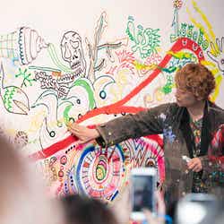この日もセレモニー後には観客が見守る中でライブペインティングを実施。「10万人ってすごいよね」とファンと会話を楽しみ、「10万って0何個だっけ?…次が1?」とファンに助けられながら緑の絵の具で「100000」をモチーフにした画を描いた。