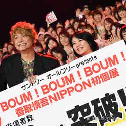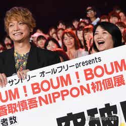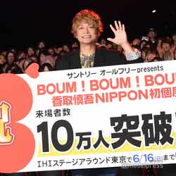 香取慎吾が25日、東京・豊洲のIHIステージアラウンド東京にて開催中の「BOUM!BOUM!BOUM!(ブン!ブン!ブン!)香取慎吾NIPPON初個展」が来場者10万人を突破したことを記念し、同展にてセレモニーを開催。サプライズで登場し、観客を喜ばせた。