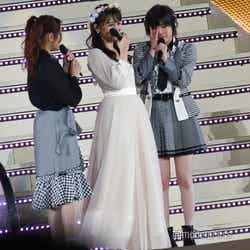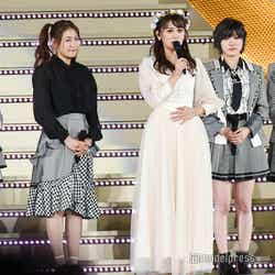 その後、再びAKB48のメンバーがステージに集まり、小嶋のドレス姿を見た岡田は思わず涙。西野と2人で小嶋に寄り添い、加入当時次世代エースとして切磋琢磨した“三銃士”が並んだ。