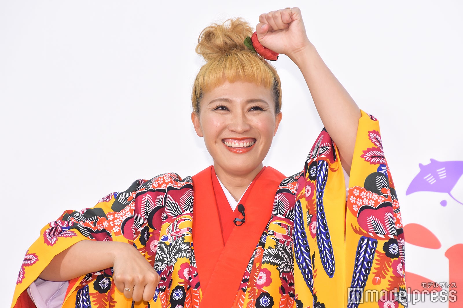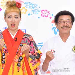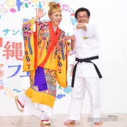 タレントの丸山桂里奈が23日、都内で行われたイベントに具志堅用高とともに出席。沖縄の伝統的衣装「琉装」をまとって登場した。