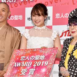 『恋人の聖地アワード』を受賞した村上は、桂氏がデザインしたというウエディングドレス姿で登場した感想を聞かれると「フィッティングに行ったときもいろんなドレスを着させていただいたんですけど、こういったロングドレスを着させていただくことってあまりなくて、スケートだと短いことが多いので、すごく新鮮ですし、結婚式に強い憧れを持ちました」と目を輝かせ、桂氏に「ぜひ結婚式のときはお願いします」とニッコリ。これに市川から「(結婚式を挙げる)予定があるんですか?」と声を掛けられると、村上は「ないです!」と即答して笑いを誘った。