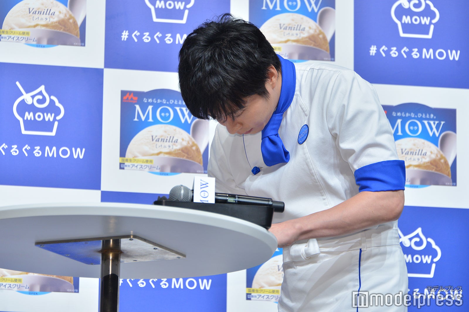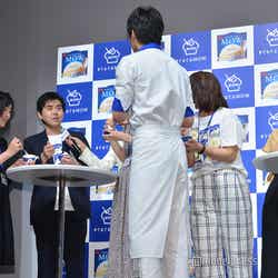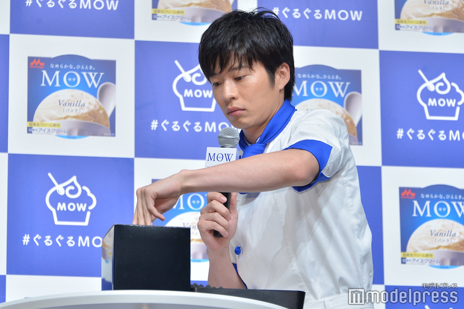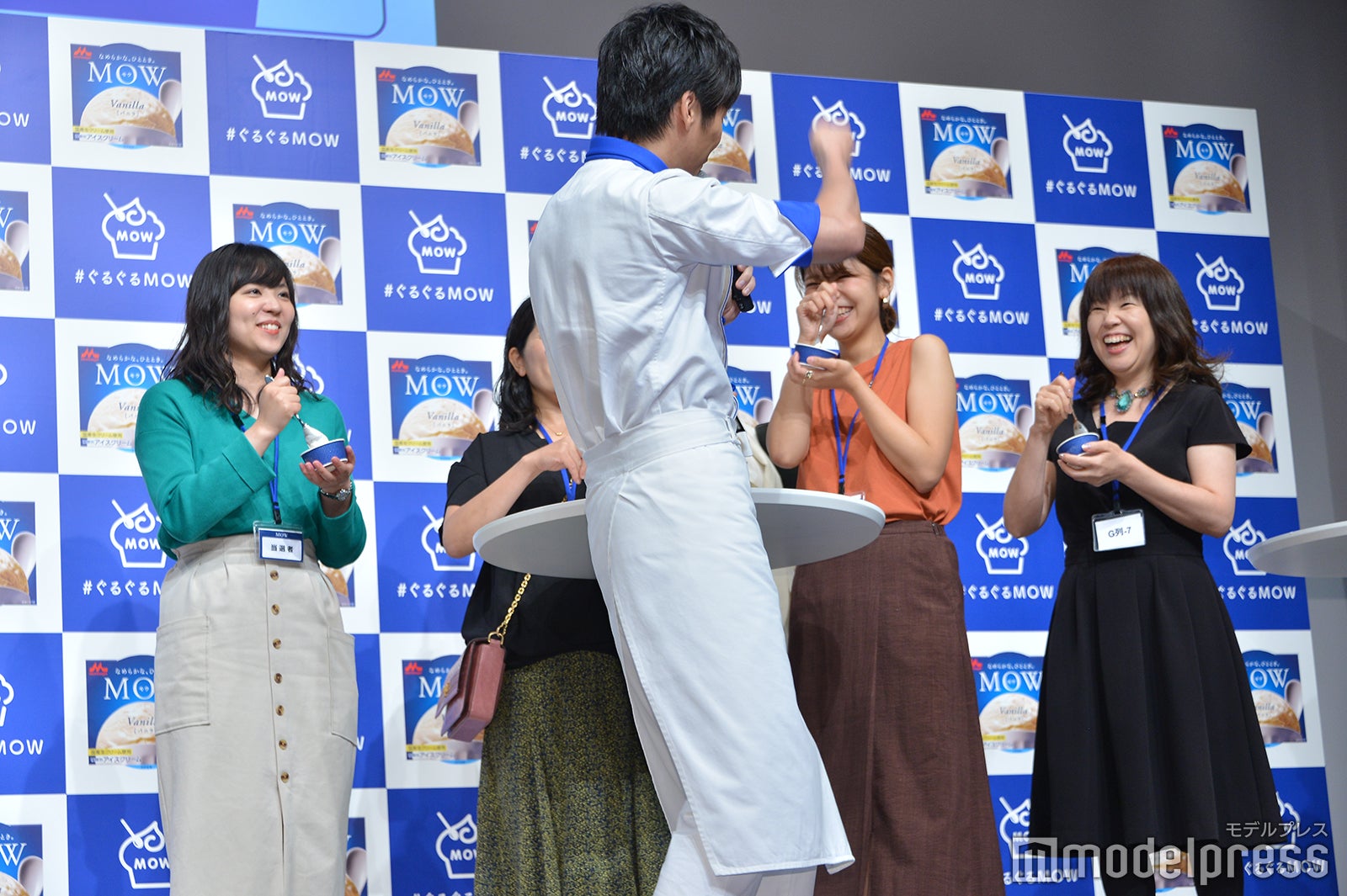 アイスのCMキャラクターを務める田中はこの日、白と青を基調としたアイス屋店主の制服姿で登場。会場には事前に行ったキャンペーンに当選した一般客の70名が来場。そこからサプライズで10名に、田中からアイスのオリジナルの食べ方を直接レッスンすることに。ファンから「濃厚でとても美味しい」「滑らかで美味しい」「舌触りが爽やか」などの感想を聞いた田中は「濃厚で美味しいいただきました!」「滑らかで美味しいいただきました!」と随時反応し、「なんだみんな俺よりコメントが上手いじゃないか…」と感嘆。MCから、次は田中の食レポの番だとふられると、だいたいの感想を聞いてしまったため「失敗した!」と苦い表情を見せながらも、「本来のピュアな美味しさであり、ぐるぐると一手間加えることによりソフトクリームのような滑らかな食感になりますね!絶品です」と店主になりきりドヤ顔でレポート。会場からは笑いと拍手が起こった。