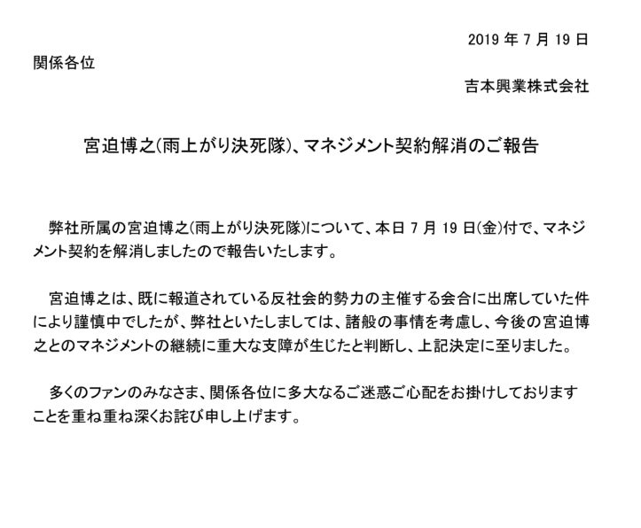 吉本興業は書面にて、「弊社所属の宮迫博之(雨上がり決死隊)について、本日7月19日付けでマネジメント契約を解消しました」と発表。「宮迫博之は、既に報道されている反社会的勢力の主催する会合に出席していた件により謹慎中でしたが、弊社といたしましては、諸般の事情を考慮し、今後の宮迫博之とのマネジメントの継続に重大な支障が生じたと判断し、決定に至りました」と伝えた。