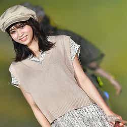 「WEGO」ステージに登場した小林は、ドット柄のトップスの上に淡いベージュのベスト、白いプリーツスカートを合わせたナチュラルガーリーなコーディネートを披露。さらにベージュキャスケット帽を被り、バックを左右で持ち替えながらランウェイ中央へ。そこで口を尖らせるキュートな仕草を見せ、会場を魅了した。