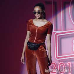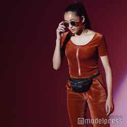 「EGOIST」ステージのトップを飾ったmaaayaは、オレンジ色のベロア生地のオールインワンに黒のウエストポーチを合わせたコーディネートを披露。胸元が大きく開いたからデザインから艶やかなデコルテが見えており、サングラスを身につけながらクールな表情で颯爽とランウェイを歩いた。