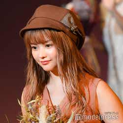 「MIIA」ステージでは、ブラウンのセットアップに同系色のキャスケットを合わせた可愛らしいコーディネートで登場。