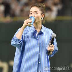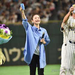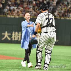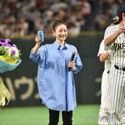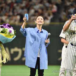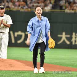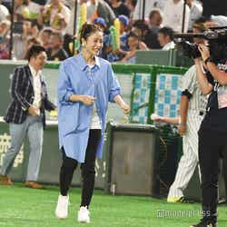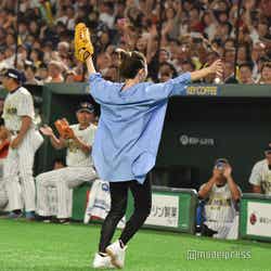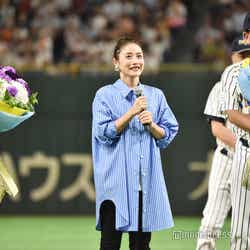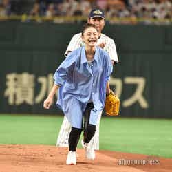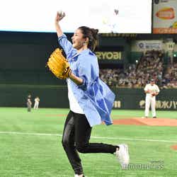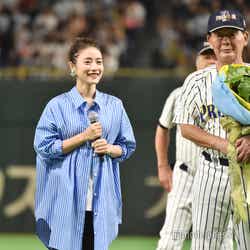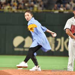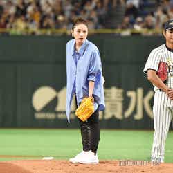石原さとみ、ノールック投法でノーバン 6年連続始球式に登場