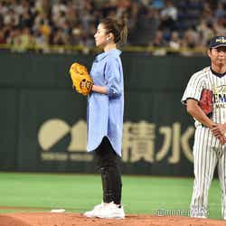 石原が同イベントで始球式を務めるのは、今年で6年連続となり、2014年はサウスポー投法、2015年はマサカリ投法、2016年はトルネード投法、2017年はサブマリン投法、2018年は2段モーション投法に挑戦。始球式前に両軍のGMと監督に花束を贈呈した石原は「満員ですごいですね」と球場を見渡し、「6年連続で来てしまいました。小学生だったら6年生になってもうすぐ中学生です(笑)」とニッコリ。「6年連続本当に嬉しいです。やりたい投法がたくさんあるんだなと毎年思います。今年も筋肉痛になりながら頑張っておりますので、皆さん温かく見守ってください。よろしくお願いします」と挨拶した。