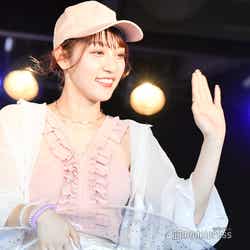 「17kg」ステージのトップバッターを飾った古川は、ピンク色のフリルが特徴的なミニ丈トップスに、白シャツとワイドジーンズを合わせたコーディネートを披露。大きく開いた首元からはデコルテが見えており、ウエストもチラリ。キャップをかぶり、浮き輪を持ったキュートな夏らしい姿で会場に笑顔を振りまいた。