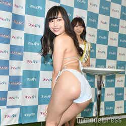 また、緑川は「昨年の秋からレースクイーンとして活動をしておりまして、6月末にグラビアアイドルとしてデビューしてファーストDVDを発売しました。アマゾンランキングでは瞬間的にではあるんですけど、2位を獲得いたしました。今、波に乗っているので、その調子で東スポさんでグランプリをとって頑張って行きたいなと思っています」と目を輝かせ、「趣味は刑務所見学や麻雀が好きなので、変わったところにも注目していただけたらなと思います」とアピール。体型管理にも気をつけているそうで、自慢のお尻を強調した。