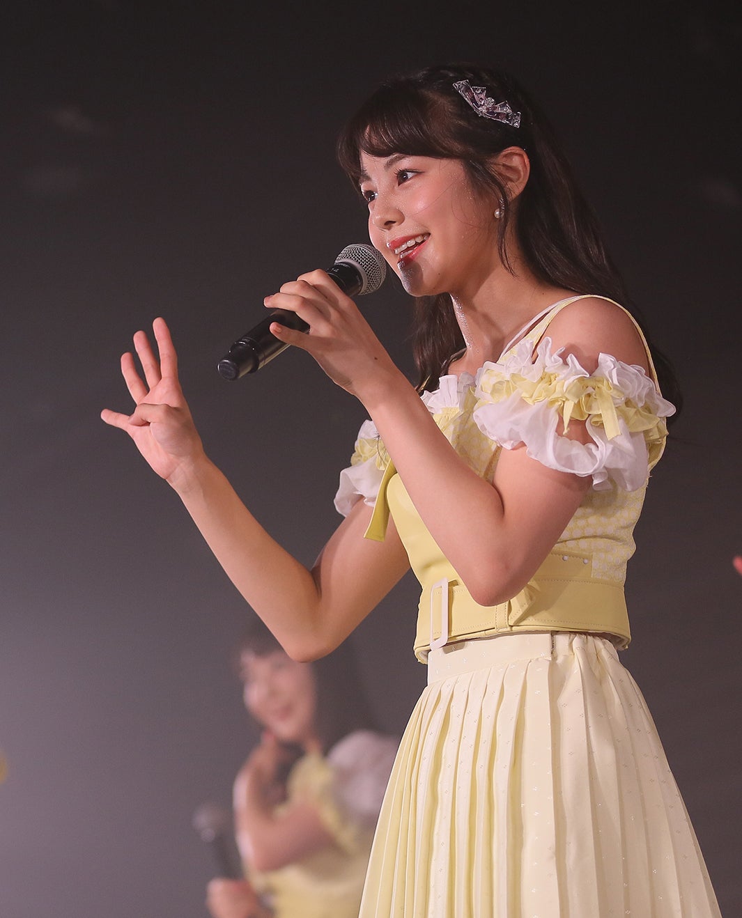 ステージに立つまでは不安な気持ちがあったんですが、Overtureが流れて照明が点いて、ファンのみなさんの顔を見た瞬間に、待ってくれていた方がこんなにも沢山いたんだと実感することができて嬉しかったです。そして、劇場公演の大切さ、ステージに立てるありがたさをあらためて感じることができました。この公演ではセンターを務めさせていただくことになりましたが、ポジションを初めて聞いた時には、みんなを引っ張っていかなくてはいけないポジションなので、正直、私で大丈夫かなとプレッシャーもありました。でも、レッスンをしていく中で、みんなが支えてくれたおかげで、公演はみんなで作っていくものだともあらためて思えたので心強かったです。