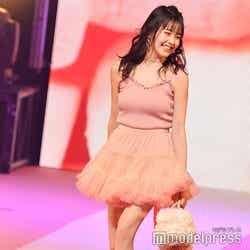 久間田は、出演するモデル自身がランウェイのコンセプトを考案しているモデルショーに3番手で登場。「りんくましゅまろ」をテーマに掲げ、くすみピンクのチューブトップに、ライトピンクのボリュームたっぷりなチュールミニスカートを合わせ、“りんか丈”と呼ばれ自身のトレードマークでもある足を露出したコーディネートを披露。