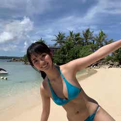 公開されたアザーカットには、澄んだ海と青空のもと、その大自然にも負けない溢れんばかりのバストと笑顔で撮影を行う豊田が収められている。