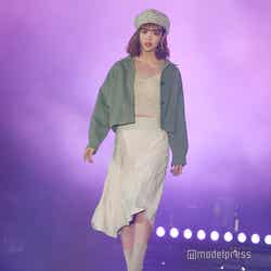 ラメアイシャドウの際立つキュートなアイメイクも印象的で、ランウェイを歩く藤田に歓声が響いていた。