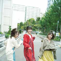 同誌初登場となった3人。秋スタイルで元気いっぱいの姿やノースリーブで素肌を披露している。(modelpress編集部)