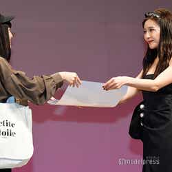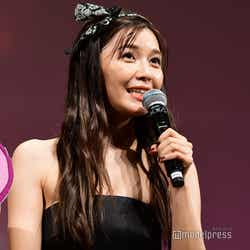 肩と背中を大胆に出したブラックのドレスで登場した宇野は「せっかく呼んでいただいたので。学園祭って、すごく華やかなお祭りというか、学校の一大イベントだと思いますので、私も気合を入れて、ちょっとドレッシーに決めてみました」と笑顔でファッションのポイントを紹介した。