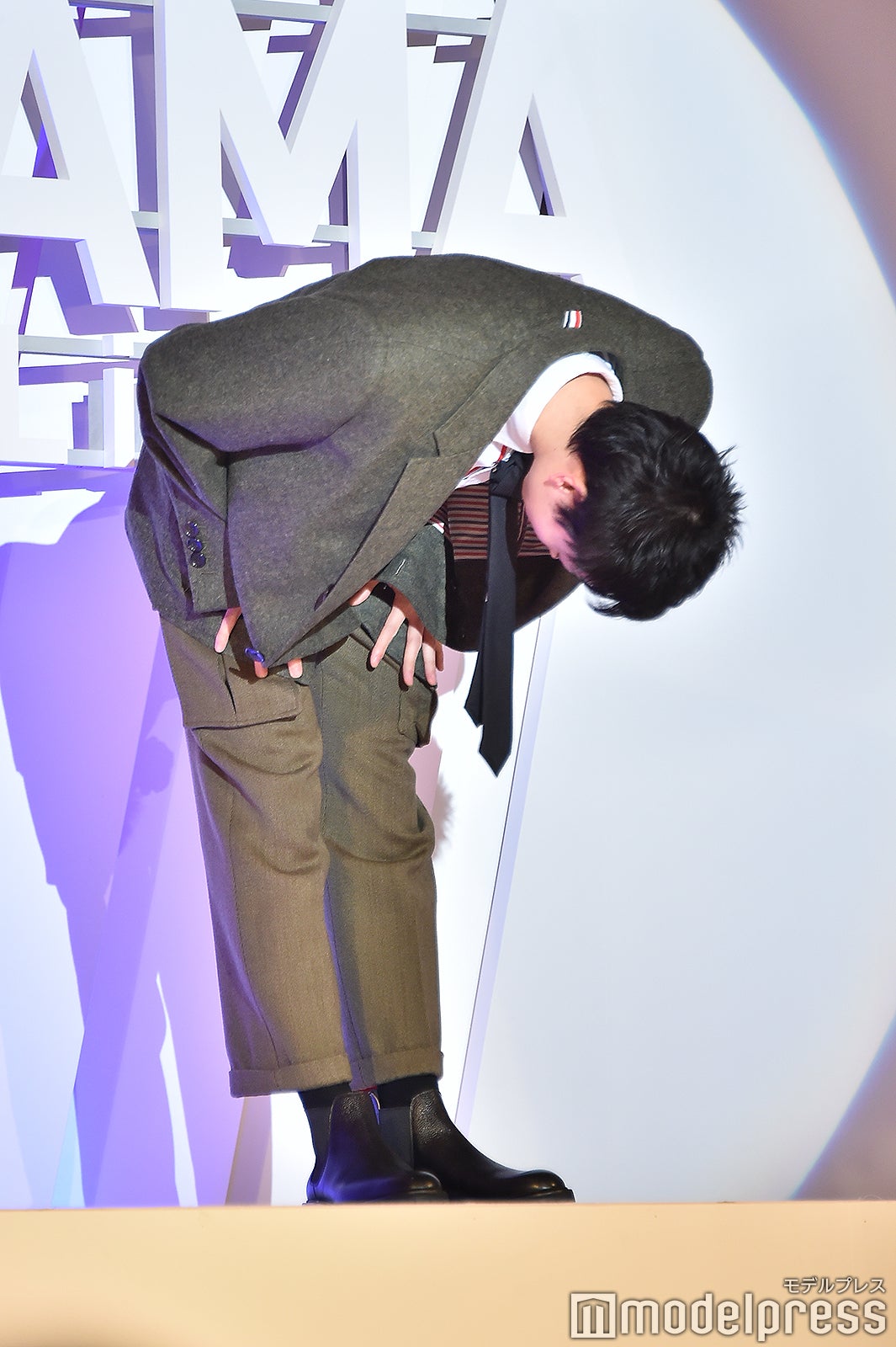 今作は、菅田演じる教師が、卒業式の10日前に生徒29人を人質にとり、数か月前に命を落とした生徒、景山澪奈の「死の真相」について「最後の授業」を行うという物語。いじめやSNSの怖さについて言及したメッセージ性の強い内容と、映像界を牽引していく若きスターが生徒役を演じたことが話題を呼び、特に若い世代に支持を集め、菅田の鬼気迫る熱演には絶賛の声が寄せられた。スーツ姿で登壇し、トロフィーを受け取った菅田。司会の石坂浩二から「芝居は時代によって違うと思うんですけど、あなたを見てるとまた次の世代の演技だと思ってしまう」と絶賛を受け、「演技派ですね」とマイクを向けられると、「それでマイクを向けられるのも照れます」と照れ笑い。