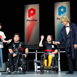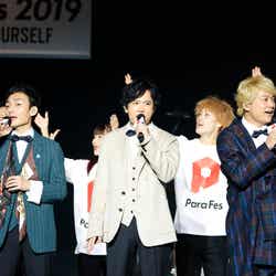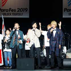 パラアスリートとアーティストたちが共演し、新感覚のライブエンターテインメントを届ける同イベント。パラサポのスペシャルサポーターを務める3人は、ナビゲーターとしてパラスポーツの魅力を発信。オープニングから「みなさんパラフェスへようこそ!」(香取)、「パラフェス2019、今年のテーマは応援です!」(稲垣)、「選手の皆さんに大きなエールをお送りしましょう!」(草なぎ)と力強く呼びかけ、約6300人の観客を盛り上げた。イベントでは稲垣がアーチェリー、草なぎが5人制サッカー、香取がパワーリフティングのナビゲーターを務め、草なぎはブラインドサッカーのドリブル、PKを体験。ドリブルではボールを見失ってしまったものの、PKでは見事ゴールを決め「奇跡ですね!」と興奮を伝えていた。