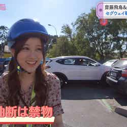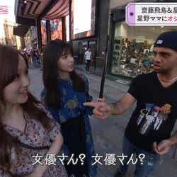 セグウェイで街観光を楽しんだ後、お土産探しに出掛けた2人は、ネットで見つけた雑貨屋さんを探しに中心街を歩くことに。途中、齋藤が「気になる!」と、フローズンヨーグルトのお店を見つけ、2人とも口にチョコレートをつけながらしばしスイーツを堪能。ひとしきり休憩をはさんだ後、さらに歩みを進めていると、突然コワモテのお兄さんから「女優さん?」と英語で話しかけられるハプニングが。齋藤が「ジャパニーズ、ベリーベリーポピュラー」ととっさに返すと、お兄さんは「なんて名前?」と興味深げにさらにぐいぐいと質問。それに対し、齋藤が「シークレット!」と口元で指をクロスするポーズをとると、お兄さんも脈ナシと判断したのかその場を去っていった。齋藤の機転の利いた回答に、視聴者からは「飛鳥ちゃん対応うまい」「飛鳥回避能力高い!」と齋藤の完璧な対応を絶賛する声が殺到した。