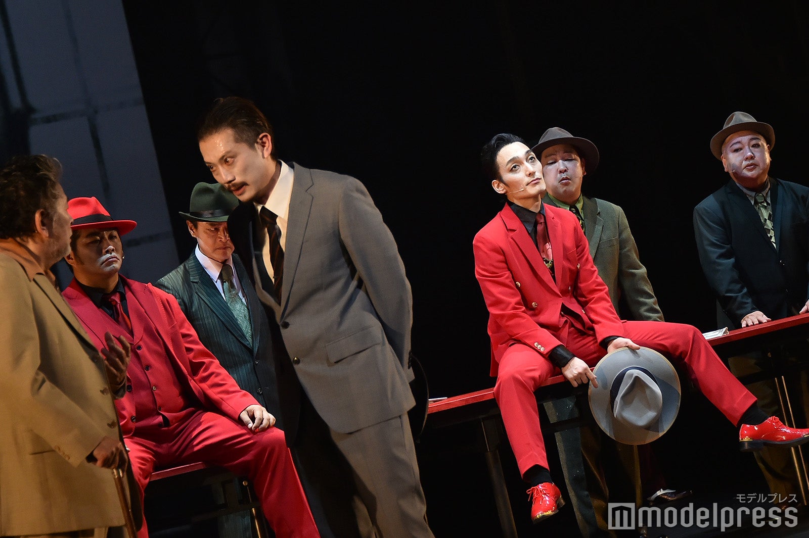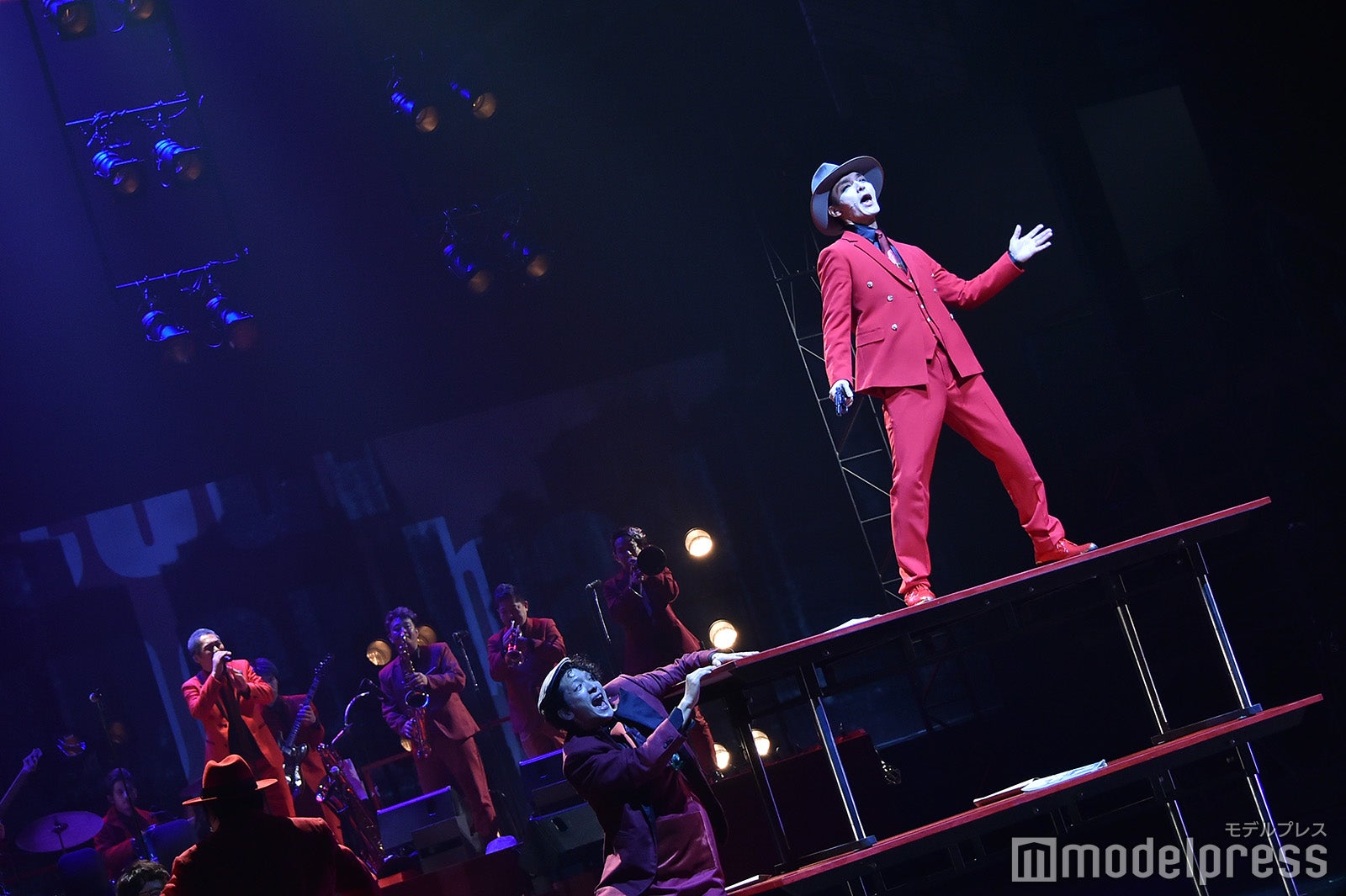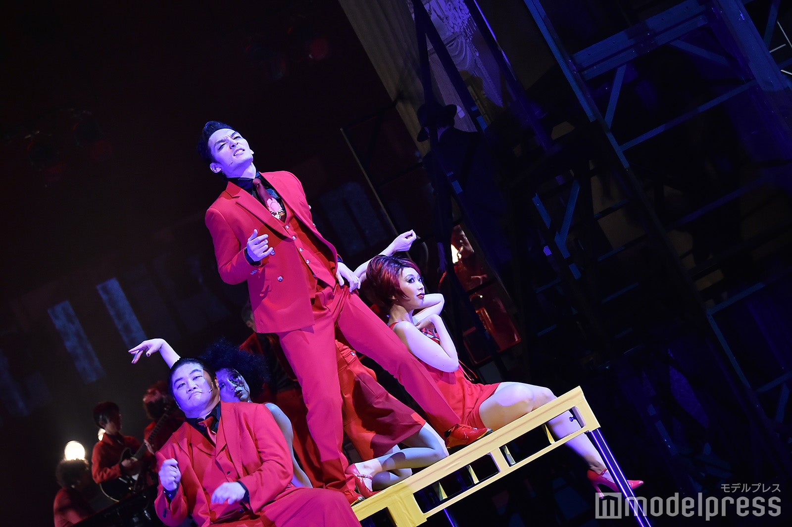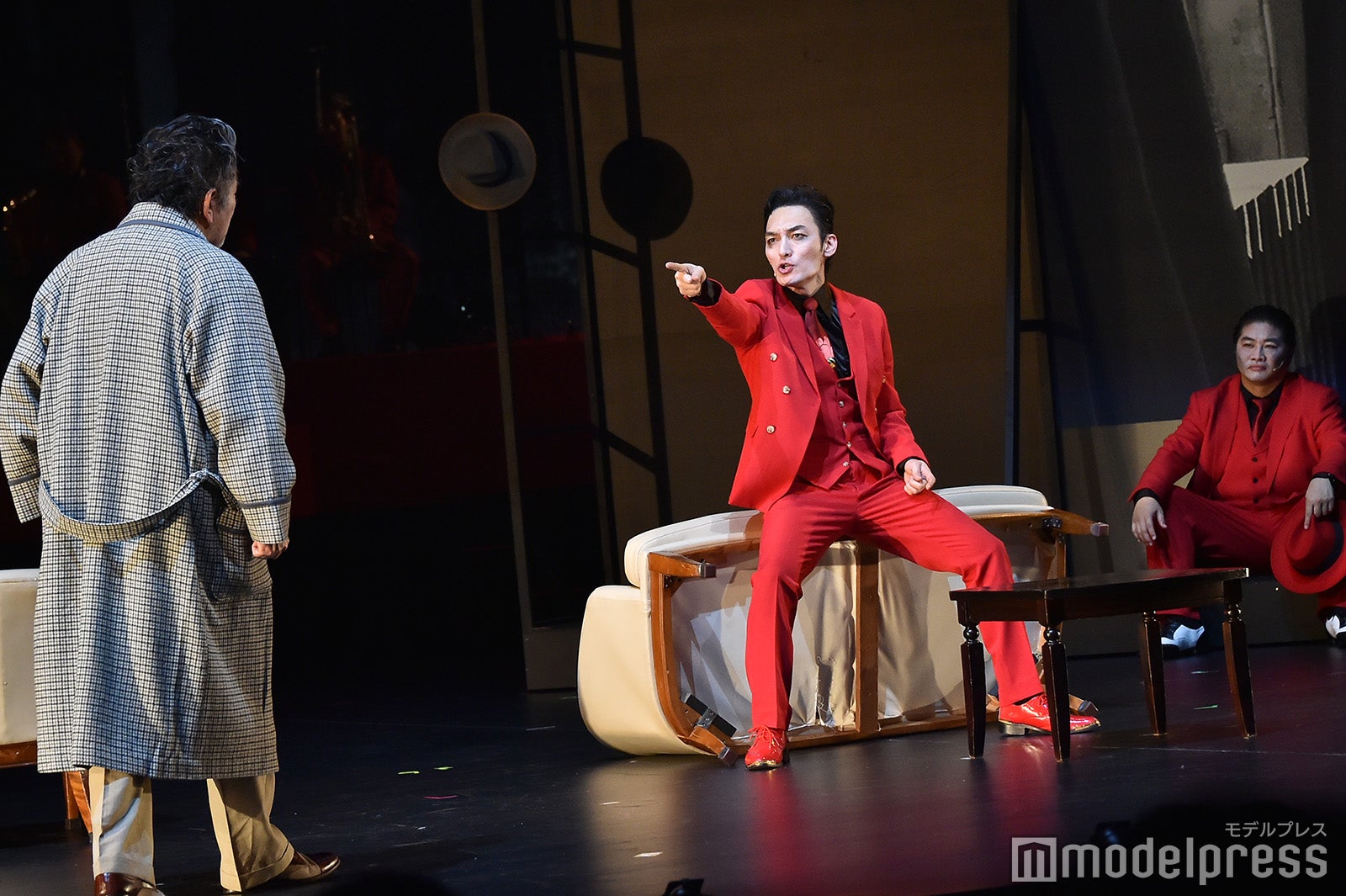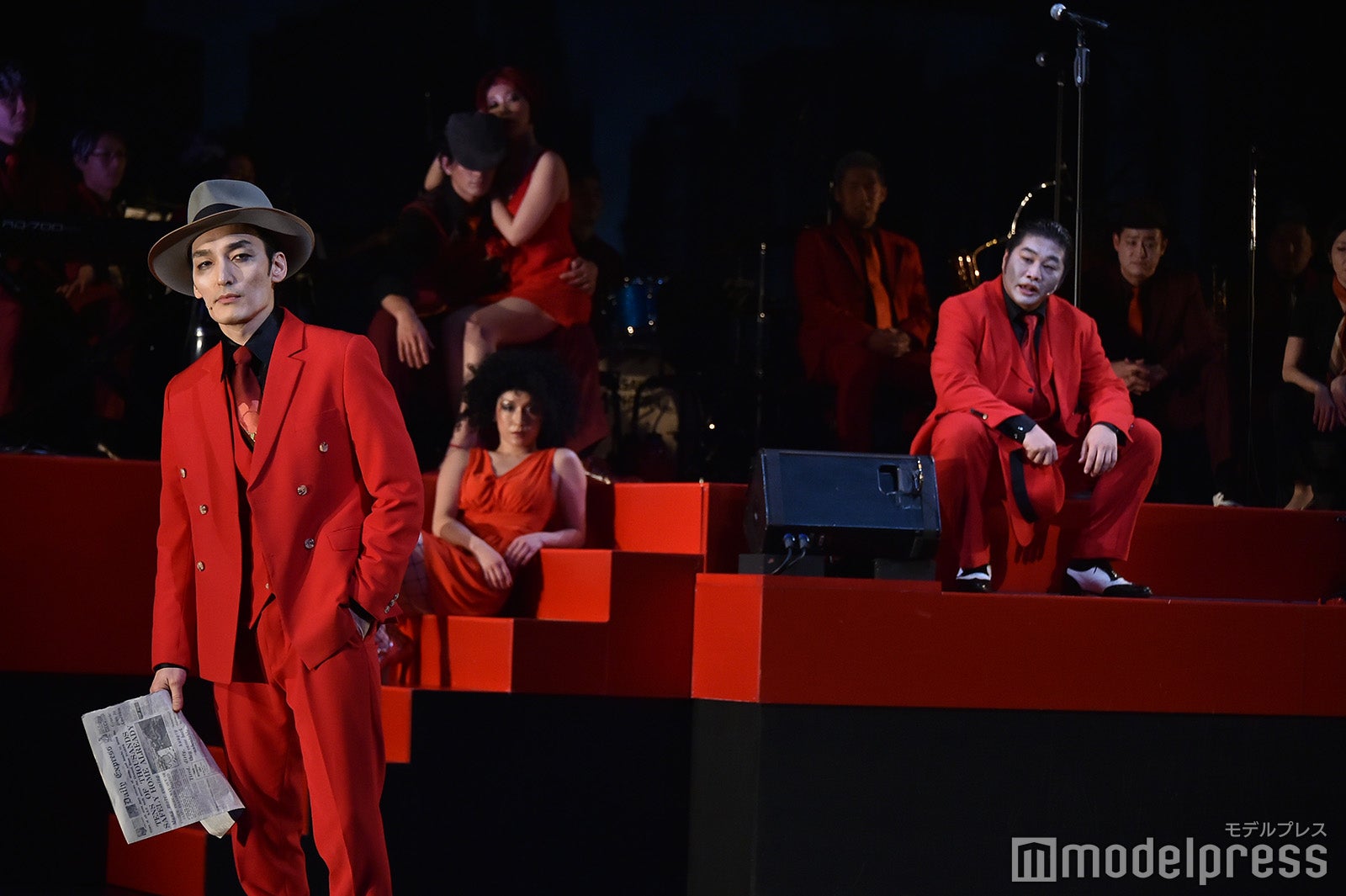 ステージには真っ赤な生バンド隊がずらりと並び、舞台のあらゆる場面で“ギャング”草なぎが歌い、踊る。狂気に満ちた表情、怒りが滲む表情、色気が溢れる表情とさまざまな顔を見せ、ステージだけでなく客席全体を使って動き回る姿は圧巻。
