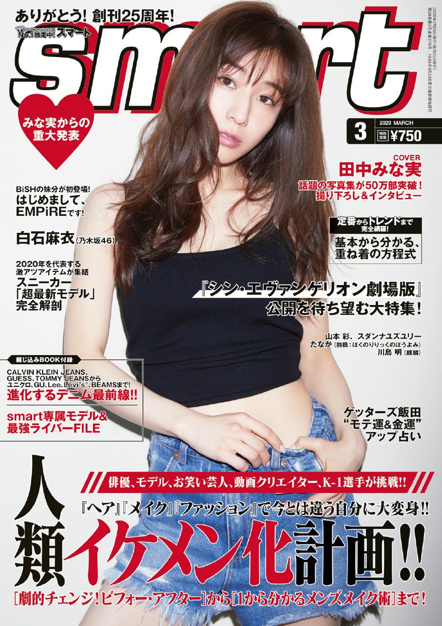 フリーアナウンサーの田中みな実が、発売中の男性ファッション誌「smart」3月号通常版(宝島社)の表紙に登場。2月号増刊号に続き、異例の2号連続でカバーを飾った。
