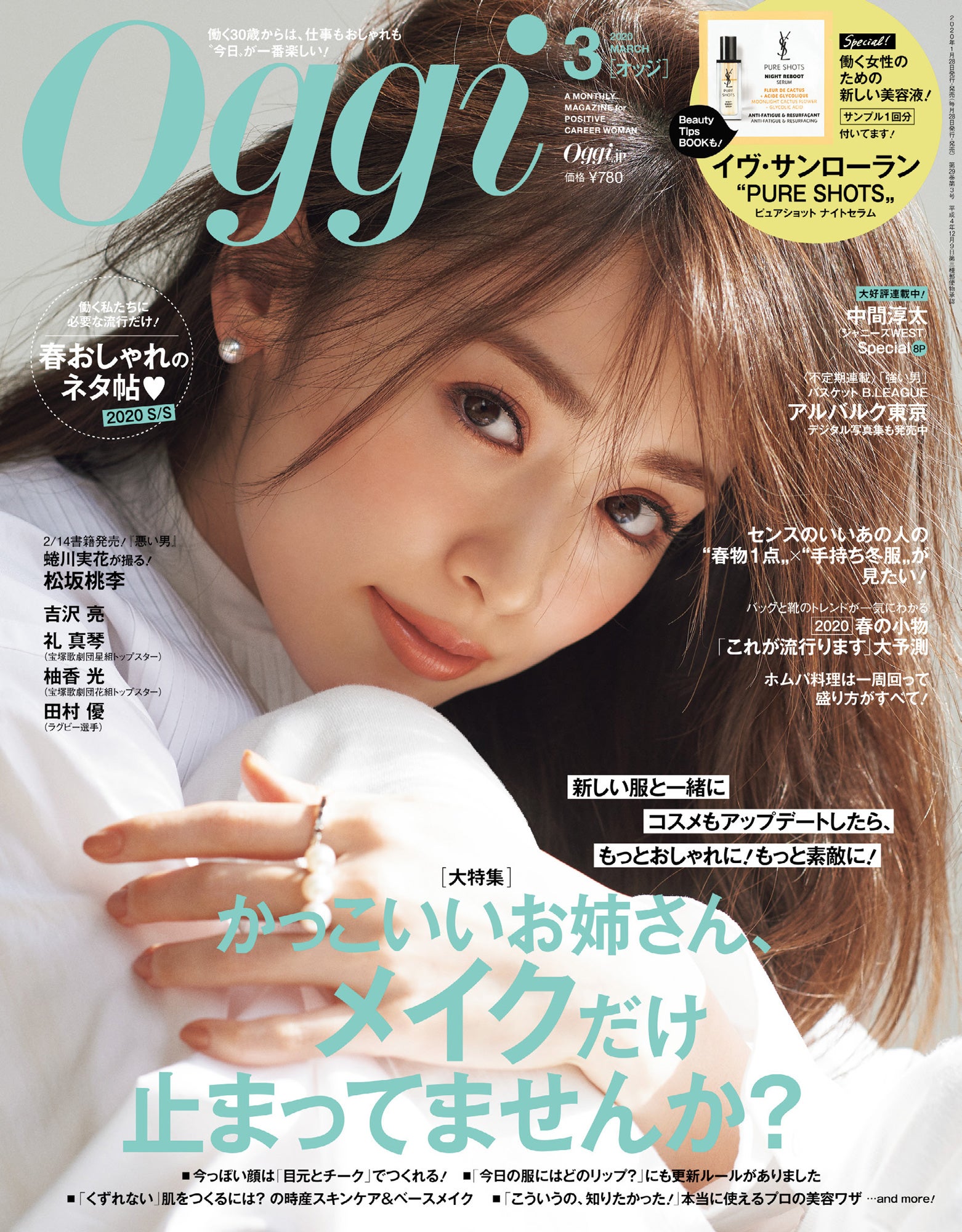 2月号に引き続き、2号連続表紙を飾った泉。今回の表紙撮影は美容がメインの号ということで、ぐっと顔に寄った撮影に。泉も「今まで担当したOggiの表紙は、引いたカットが多かったので新鮮!」と語る。スタイリングも、メイクを引き立たせるべくオールホワイトに。ノーカラーシャツに白デニム、パールのアクセサリーで可愛いらしさも際立つ。また春へ向けての号ということで、抜けのあるメイクを意識。いつもより目元は締めず、優しいまなざしに。ピンクよりもコーラルよりで、ヘルシーに仕上げた。