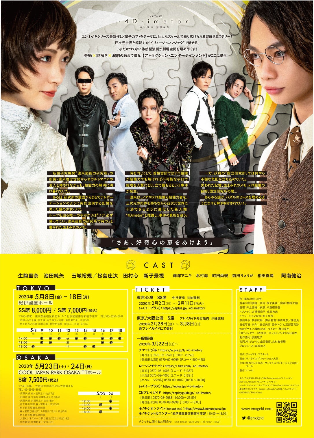 「エン*ゲキ(エンターテインメント+ゲキ)」とはは、役者・池田純矢が自身の脚本・演出により、「演劇とは娯楽であるべきだ」の理念の基、誰もが楽しめる王道エンターテインメントに特化した公演を上演するために作られた企画。演目ごとに学問のジャンルからテーマを定め、エンターテインメント作品に見事昇華させている。(modelpress編集部)エン*ゲキ#05「- 4D -imetor」