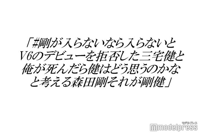 そこで見つけたのが「#剛が入らないなら入らないとV6のデビューを拒否した三宅健と俺が死んだら健はどう思うのかなと考える森田剛それが剛健」というハッシュタグ。投稿数は決して多くなく、今はもう使われていないようですが、このハッシュタグから“剛健コンビ”の関係性、尊さ、すべて伝わるのではないでしょうか!?