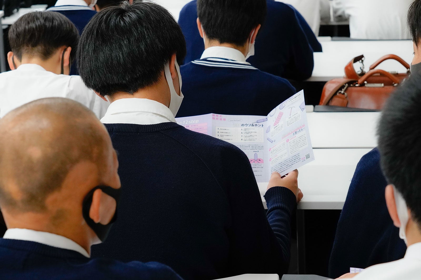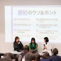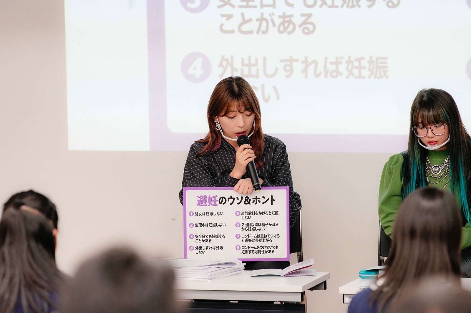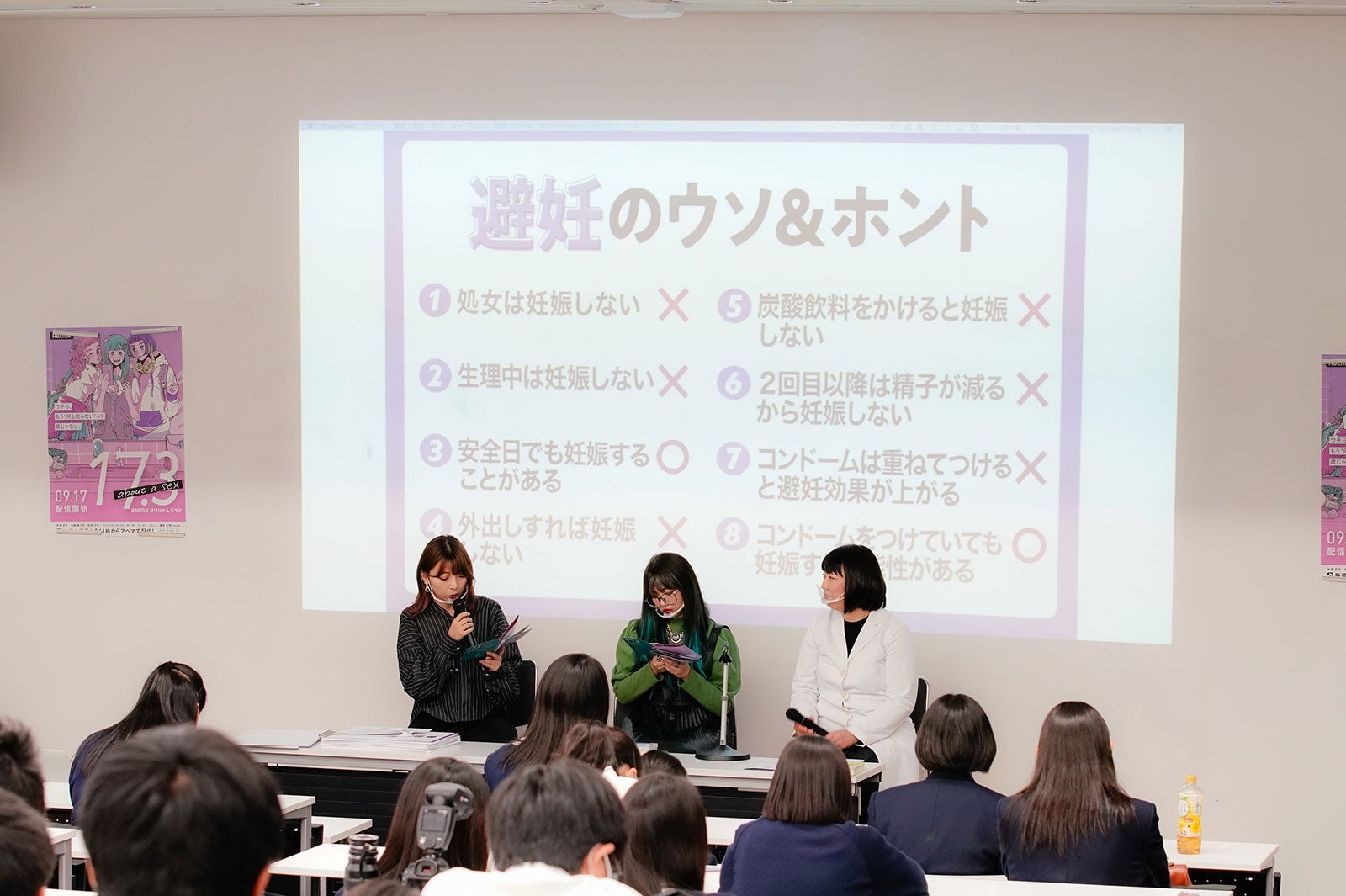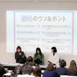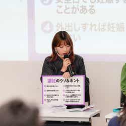続いて“避妊と性感染症”のコーナーでは、“避妊のウソ&ホント”について10つの噂の真偽を高橋氏が解説。高橋先生の「安全日なんて無い、ということは皆さんには覚えておいてほしいです。男性の精子が女性の体の中で3~7日で妊娠させる力も持っているという説もあるんです」という解説コメントには、会場の生徒も驚きの様子を浮かべていた。