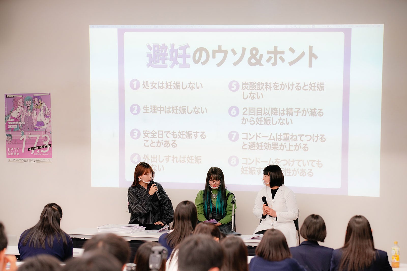 同イベントには、同作に特別協力を行ったクリエイティブディレクターの辻愛沙子氏、医療監修の埼玉医科大学産婦人科・高橋幸子氏、リアル17.3代表としてひかりんちょが登壇したほか、ドラマに特別出演している藤原紀香がサプライズ登場。参加した近畿大学附属高等学校の生徒約100名に向けて、性に関する特別授業を行った。特別授業では“交際と性的同意”“避妊と性感染症”“性の多様性”など、ドラマと連動した高校生にいま知ってもらいたいテーマをもとに、辻氏、高橋氏、ひかりんちょが集まった生徒に向け自身の赤裸々な経験や意見を交えつつフリーディスカッション形式で進行。授業の最後には授業内でも使用された”17.3 about a sexオリジナル性の教科書”とお守りとしてドラマでも登場する“オリジナルデザインコンドーム”が配布された。