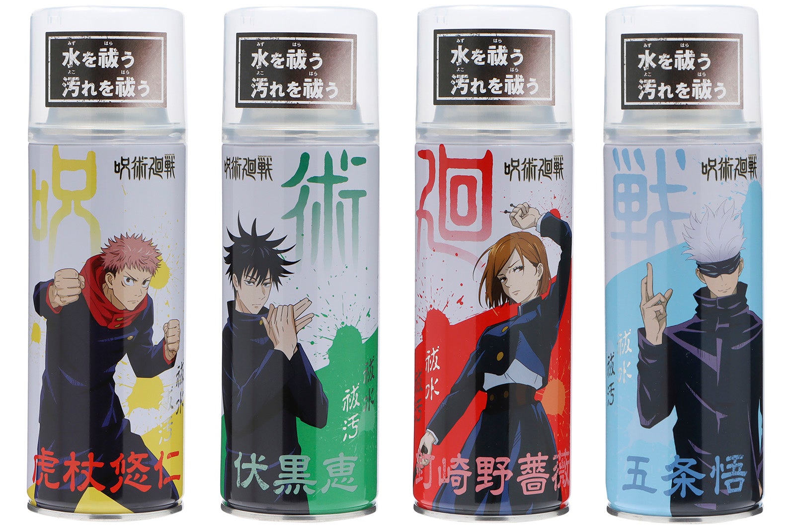 同作は、週刊少年ジャンプ(集英社)にて2018年より連載中の芥見下々による同名漫画を原作としたダークファンタジー。今回登場する「呪術廻戦デザイン防水スプレー」は、“水を祓う 汚れを祓う”のフレーズとともにメインキャラクター虎杖悠仁、伏黒恵、釘崎野薔薇、五条悟が描かれたスプレー缶4本。