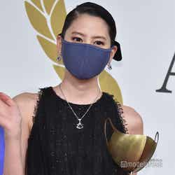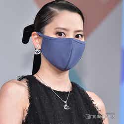 俳優・女優部門で受賞した河北は「マスクが欠かせない生活の中で、こうやって受賞させていただいて、すごく光栄に思っております」と笑顔を見せ、MCから美脚を絶賛されると「今日は女優部門ということで、ドレスに合わせてイヤリングのジュエリーに青のストーンを使っているので、それに合わせてマスクを青色にしてみました」と紹介。