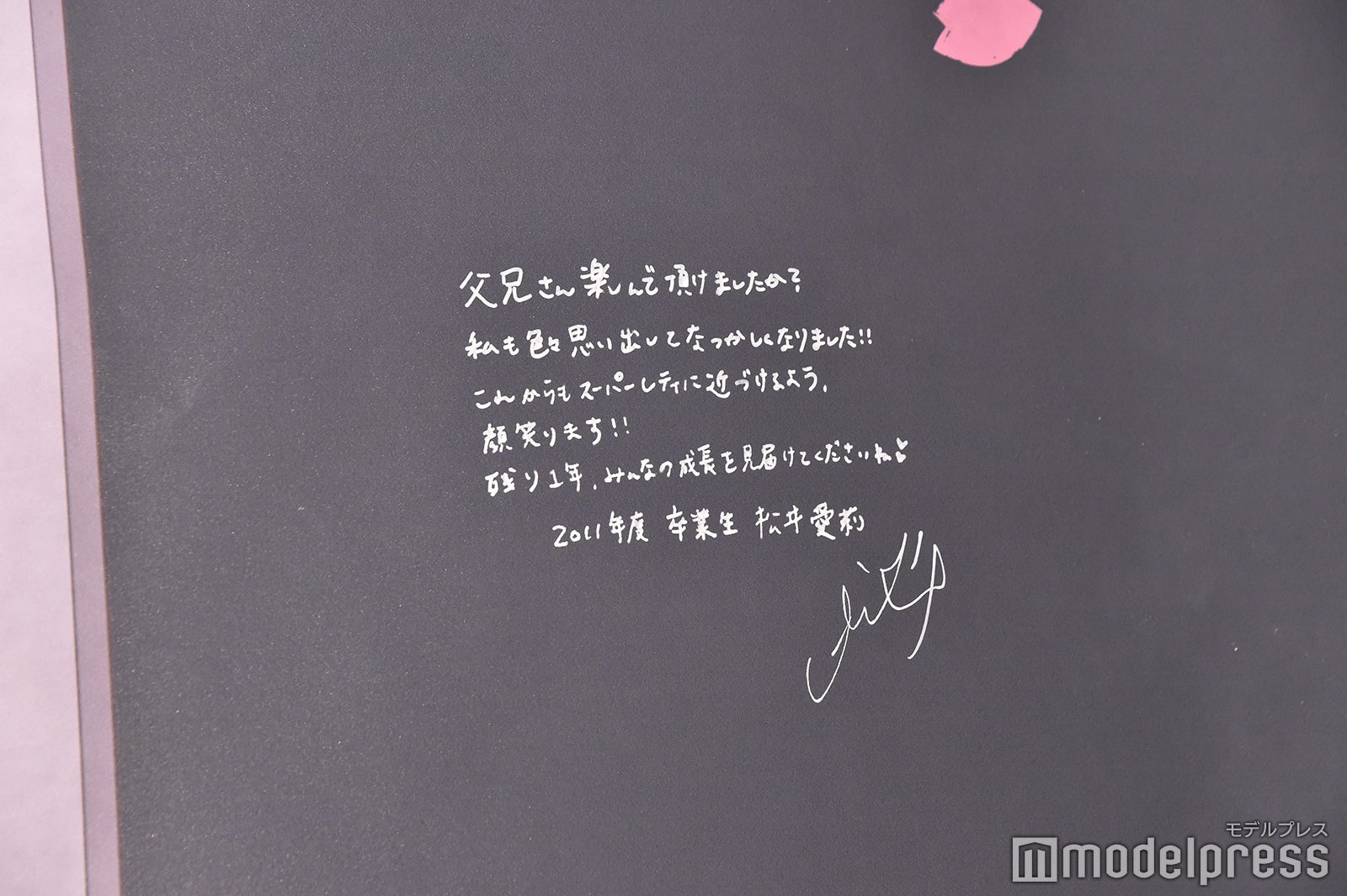 卒業生代表としてセレモニーの駆けつけた松井は、会場を見ての感想を求められると「やっぱ写真とか見ると、いろんな思い出を思い出しますよね」と感慨深げに語り、「文字で並んだときに、私たちのいた時間はこれだけだったんだなと思って寂しくなりつつ、感慨深いなと思って嬉しくもなりました」と吐露。松井にとって、さくら学院はどんな場所だったか尋ねられると「すごく成長させてもらったと言いますか、成長する過程を作ってくださって、校長先生にビシバシと鍛えられたので、そういった面では今となってはありがたかったなと思います」と感謝した。