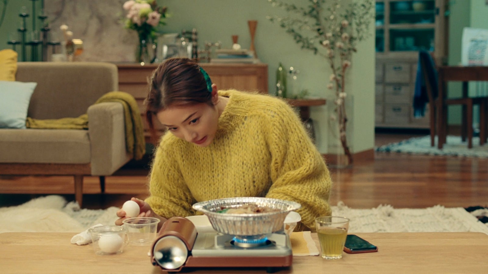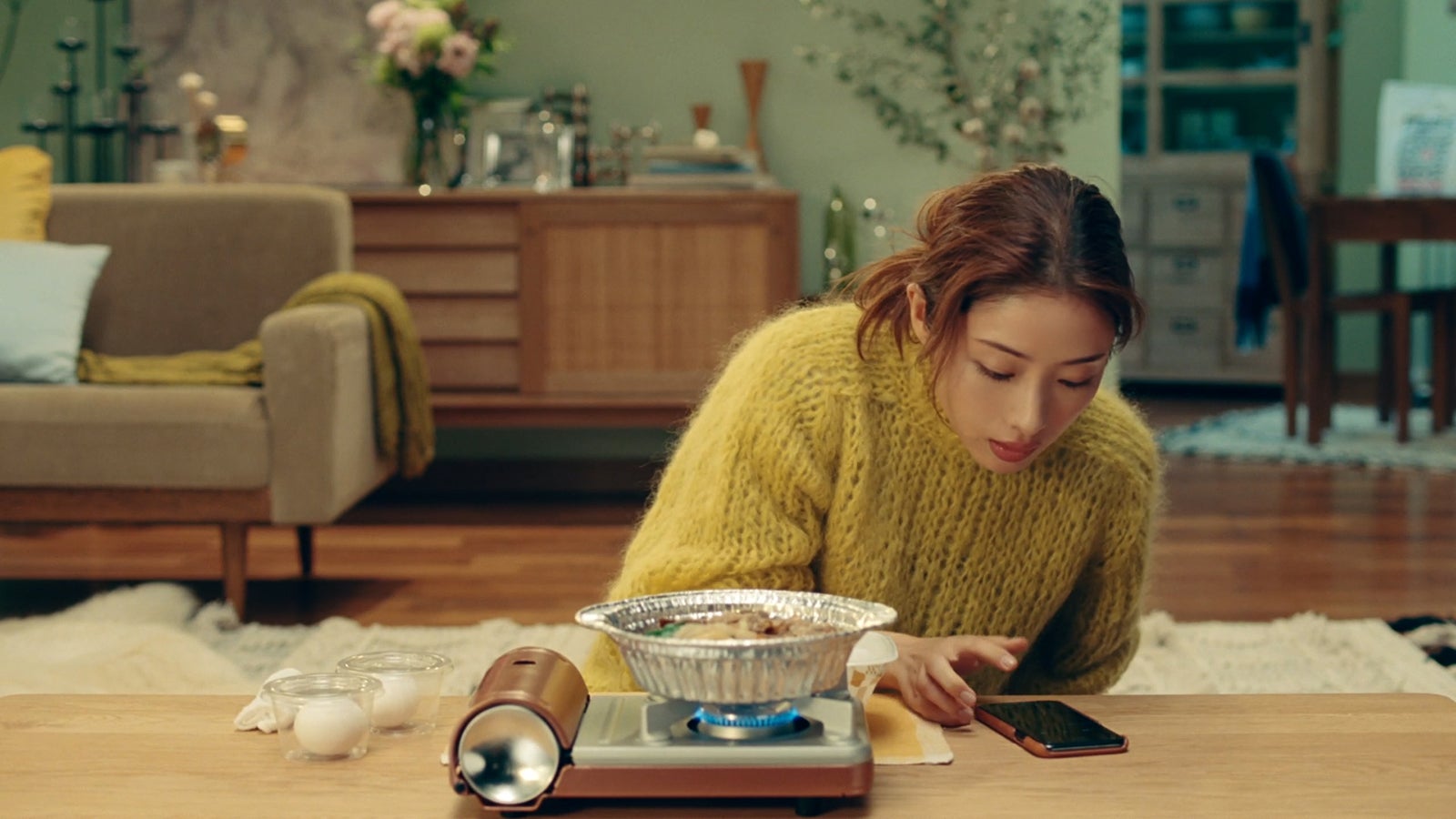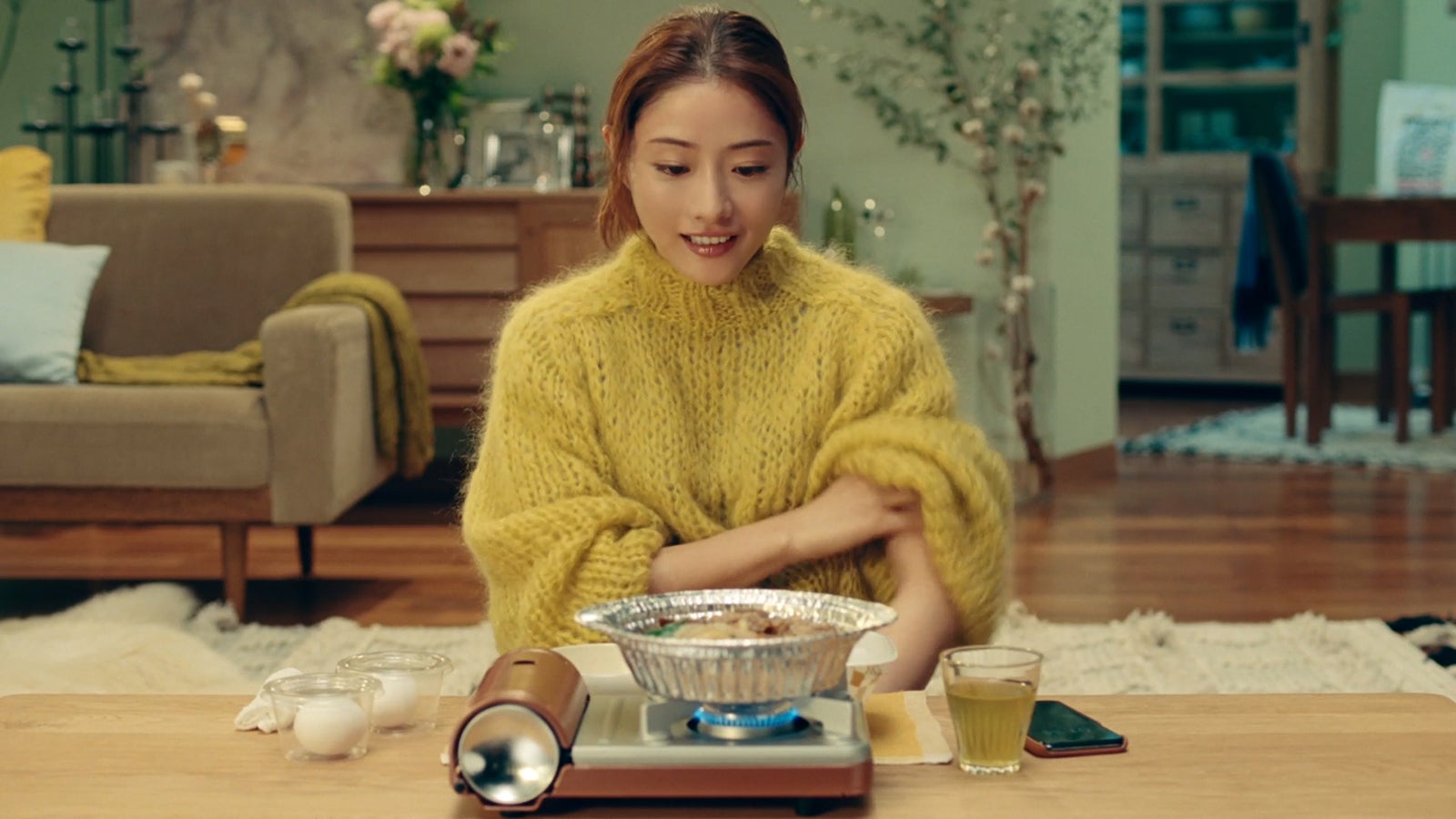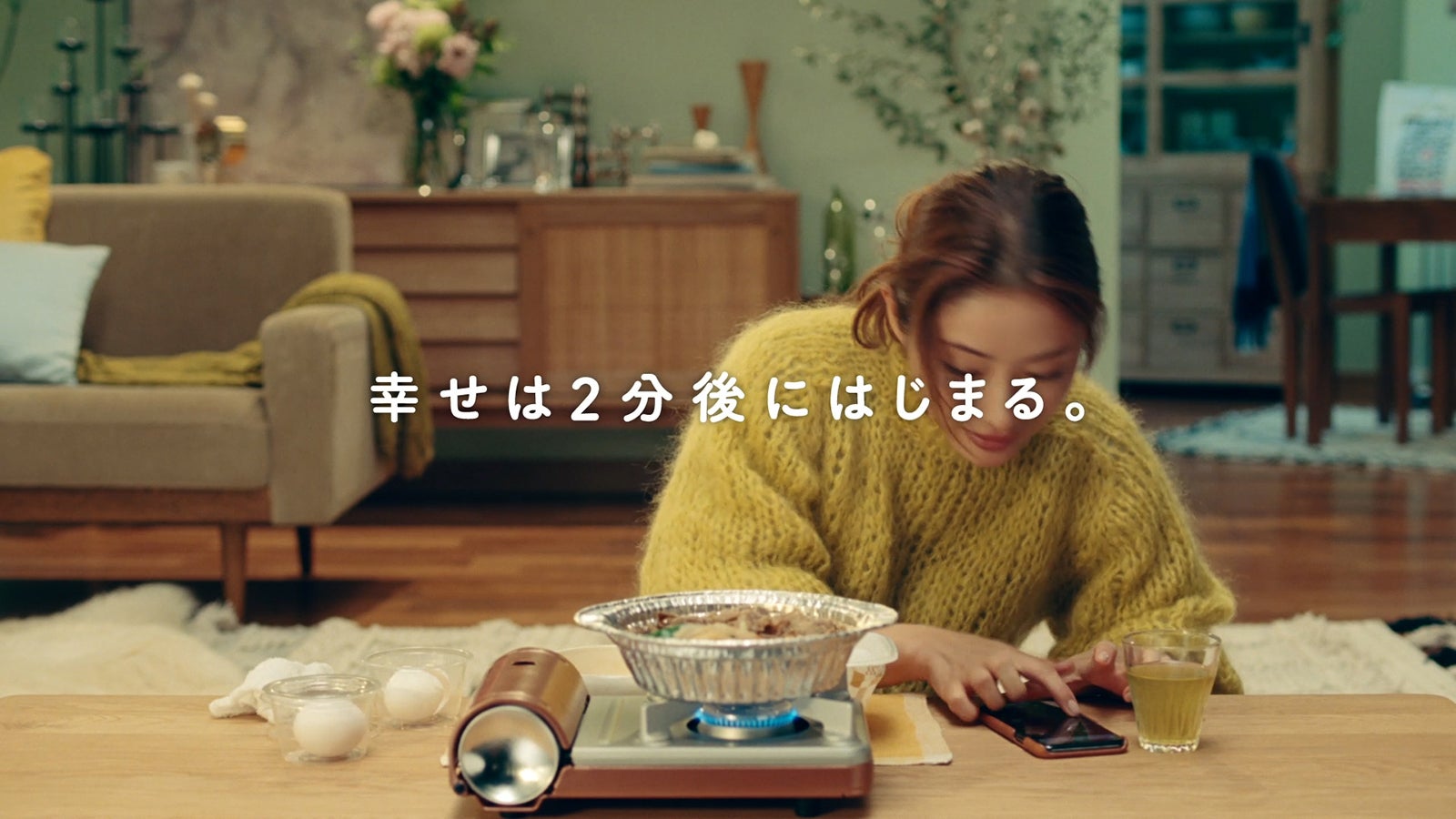今作では、鍋を火にかけ煮込む時間を“幸せまでの2分”とし、グツグツと煮込まれる具材やおいしそうな匂いを楽しむ石原の表情を描いている。