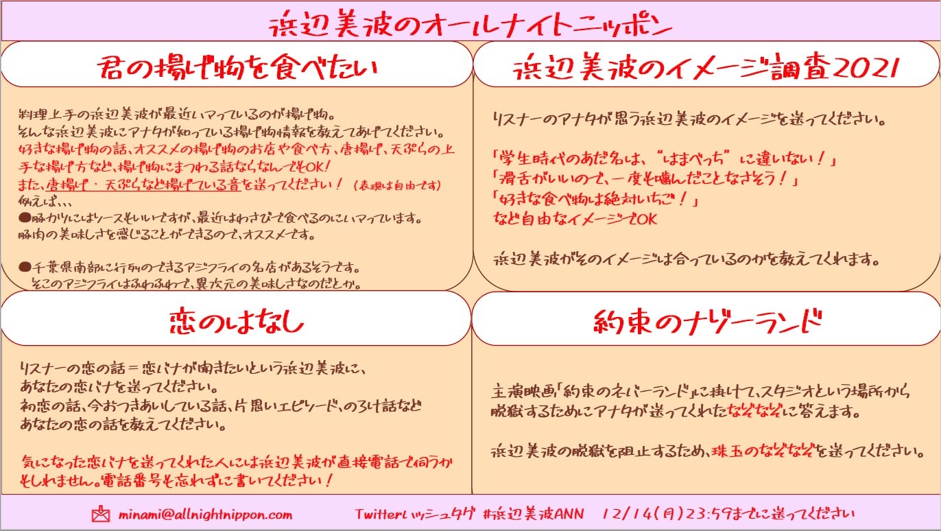2019年12月まで『オールナイトニッポン』が始まる直前の5分間、『浜辺美波 真夜中のシンデレラ』を担当していた浜辺。この度、1年ぶりにニッポン放送の真夜中に帰ってくることが決定した。番組でも度々「オールナイトニッポンが好きでよく聴いている」と語っていたが、満を持して『オールナイトニッポン』に初挑戦する。番組では現在、浜辺へのメッセージを募集中。リスナーが考えたなぞなぞに挑戦したり、恋愛相談に乗ったり、最近ハマっているという揚げ物に関するコーナーを予定している。メールテーマやコーナーの詳細は、公式Twitter(@Ann_Since1967)まで。