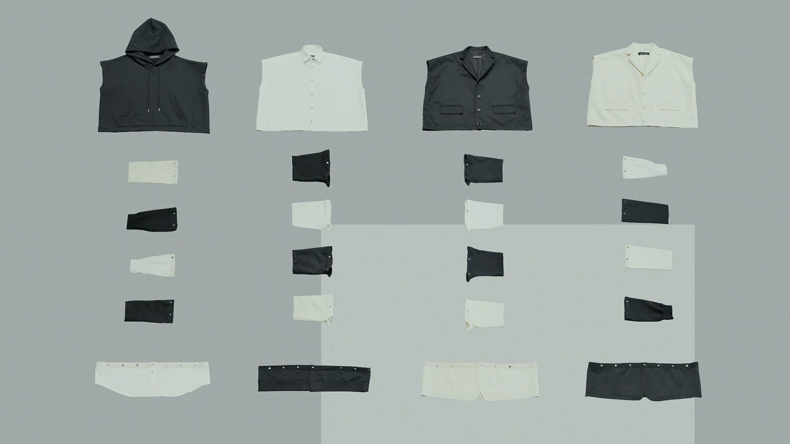 また、コンセプト映像では“出口を求めて”をテーマに、自由に組み替えができるレゴブロックのような服を制作。洋服のパーツが手元に6種類あれば、720通りの服をつくることができ、無限の答えを秘めた服となっている、