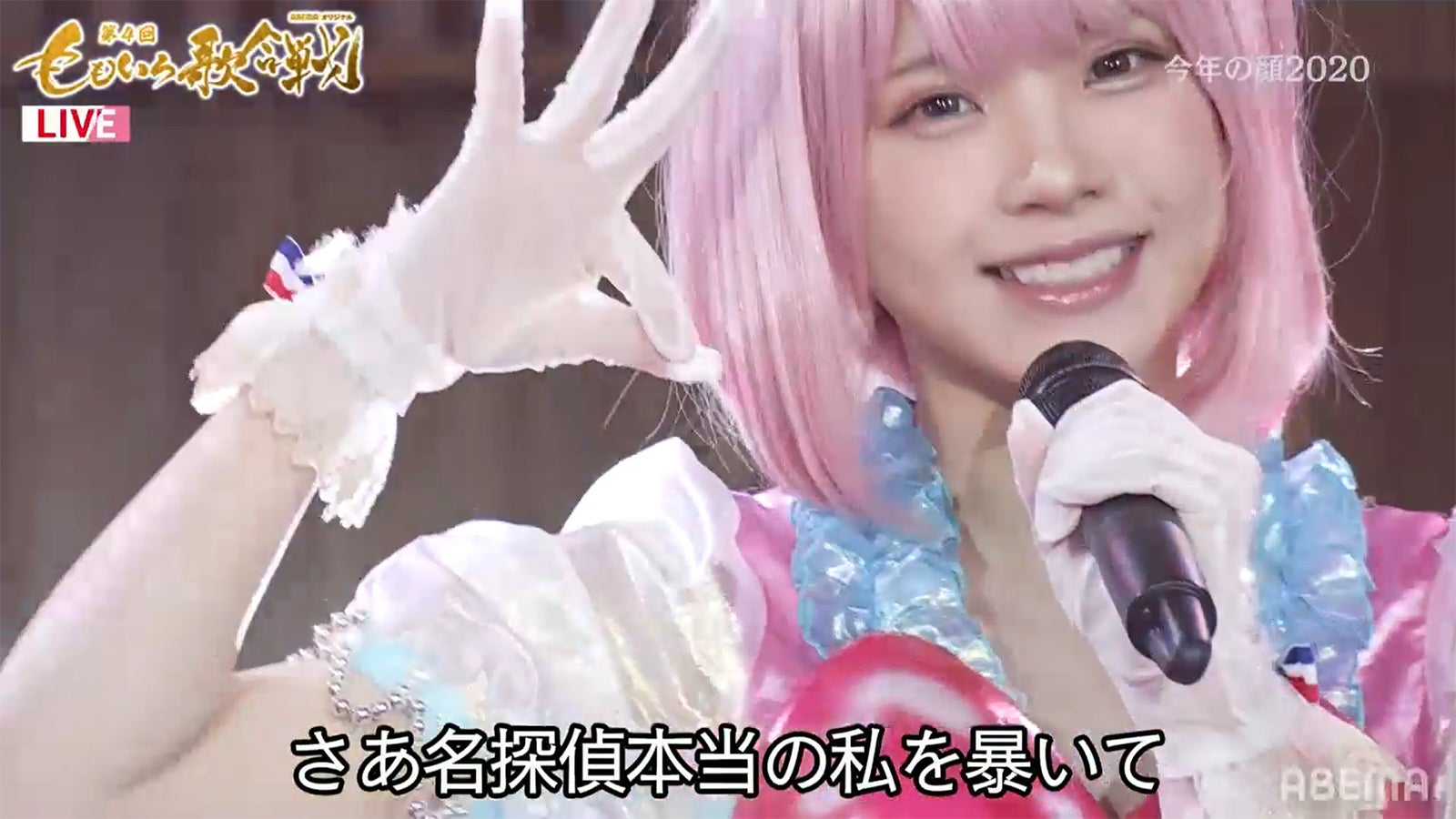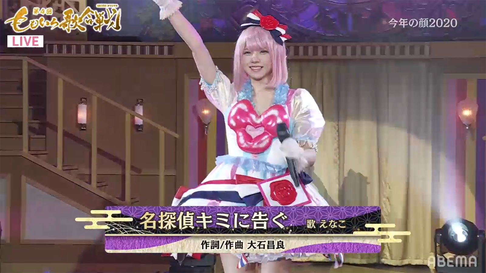 市川猿之助、ハラミちゃん、ファーストサマーウイカなどが登場した「2020年今年の顔メドレー」にて、『ドレス・レ・コード』に収録されているリード曲『名探偵キミに告ぐ』を披露。歌唱後のトークでは「2週間前にデビューして歌番組もここが始めてだったのでめちゃくちゃ緊張しました」と肩を撫で下ろすと、ももクロから「かわいい」の声が。「この前『情熱大陸』みました!」とすっかりももクロがえなこのファンになっていた。