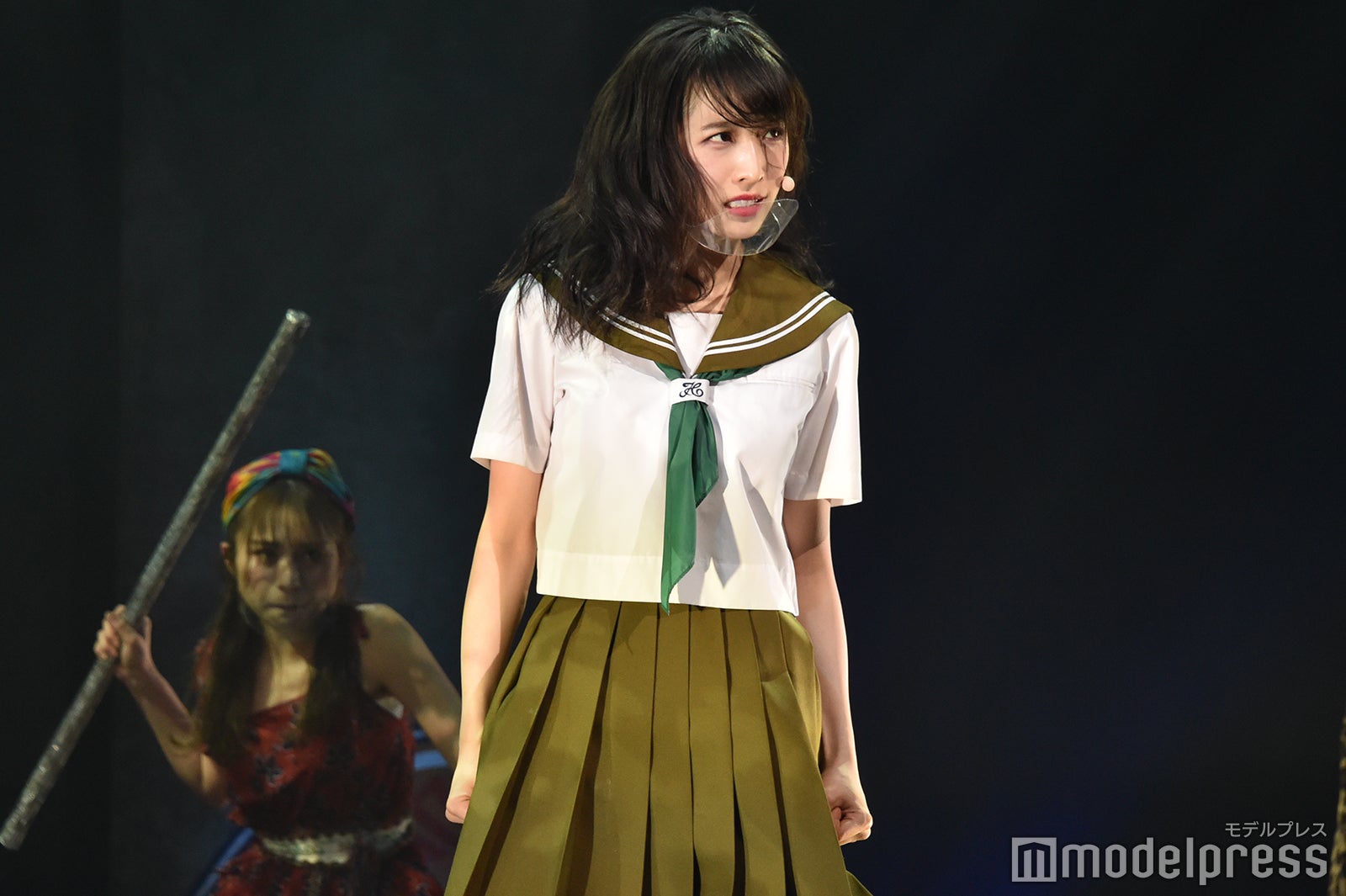 前回の舞台では横山由依がドラマ版に引き続き、網タイツに白衣姿のセクシーな担任・ラマンを熱演。今回は行天がそれを引き継いだ坂本郁美(ハレンチ先生)役に。スリットが入ったワンピース姿で美脚を大胆に披露。行天は「結構『わお~』って服装なんですけど、テンション高い面白い役なので」と笑顔でアピールした。
