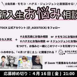 新入生を対象にした企画「おうち入学式2021」が17日のよる8時よりYouTube LIVEにて開催することが決定。同企画は、昨今の新型コロナウイルス感染症の感染拡大により、オンライン授業や新入生歓迎会の自粛など思うような学生生活のスタートを切れない新入生に向けて、“少しでも勇気を与えたい”、“学生生活に希望を持ってほしい”そんな想いが込められたオンライン入学式企画。視聴については17日よる7時に、AGESTOCK公式TwitterにてYouTube LiveのURLを配布する予定。MCに、テレビのみならずYouTubeやTikTokなどマルチに活躍し若者から絶大な人気を得ている土佐兄弟、日本一可愛い新入生を決める「FRESH CAMPUS CONTEST 2020」のグランプリに輝いた石川真衣を迎え、ゲストにBiSHのメンバー・モモコグミカンパニー、TBS系バラエティ「水曜日のダウンタウン」の企画にて誕生した豆柴の大群のメンバー・ハナエモンスター、同企画を主催する会社の代表取締役である渡辺淳之介氏が出演し、前向きでパワーを与えてくれるような祝辞を新入生に向けてプレゼントする。