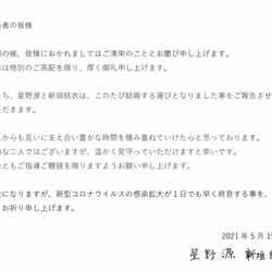 2人は連名で「私たち、星野源と新垣結衣は、このたび結婚する運びとなりました事をご報告させていただきます」と発表。「これからも互いに支え合い豊かな時間を積み重ねていけたらと思っております。未熟な二人ではございますが、温かく見守っていただけますと幸いです」と呼びかけ、「今後ともご指導ご鞭撻を賜りますようお願い申し上げます。最後になりますが、新型コロナウイルスの感染拡大が1日でも早く終息する事を、心よりお祈り申し上げます」と記した。(modelpress編集部)