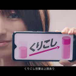 CM内では、ピンクガチャ(ガチャピン)とブルームク(ムック)が映し出された後、スマホを手に持つ深田がアップで映し出され、隣にいた永野とそれぞれセリフを。2人の目を合わせて話すセリフを合図に、高さ4mほどの空中から地上へと舞い降りCMは幕を閉じる。撮影では、深田と永野の2人が、初夏を感じる爽やかな青いワンピースをまとって登場。スマホを手に持ち、顔のヨリの撮影シーンでは、2人の透明感あふれる表情と、優しいまなざしが印象的なカットとなった。