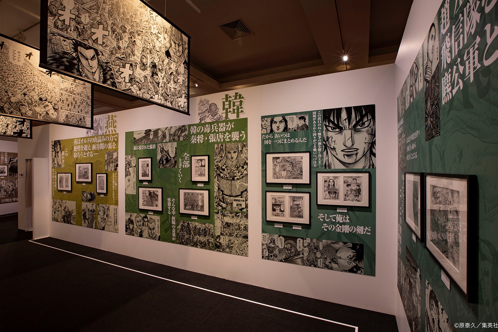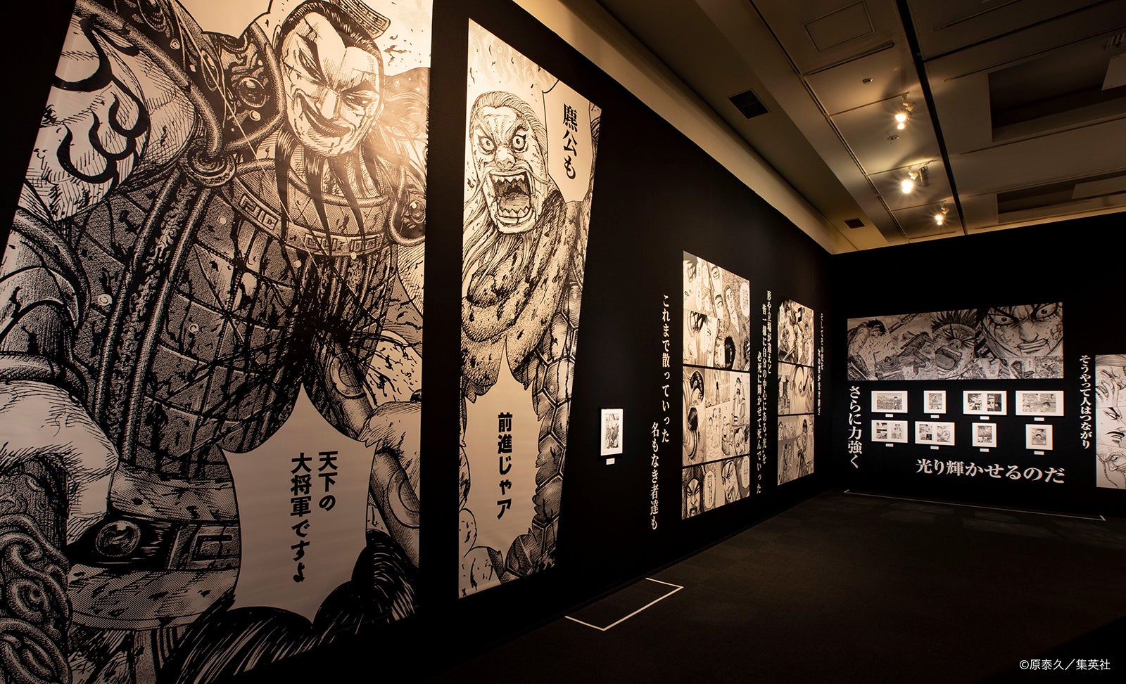 15年に及ぶ連載の中から、第1話「無名の少年」から第438話「雄飛の刻(とき)」に至る仲間や敵との出会い・別れを糧に成長を遂げる主人公・信の物語を、作者・原泰久氏全面監修のもとに再構築。400点以上の直筆生原画や、本展のために描きおろされたイラスト約20点などを展示。開幕にあたって、原氏は開幕にあたって「ようやく開幕を迎えることができたいへん嬉しく思います。この展覧会は、信の物語を“空間”で体感できる内容にしました。原画や描きおろし、巨大グラフィックを一緒に鑑賞することで、原作コミックスを読むのとはまた違う体験を楽しんでもらいたいです。展示作品の数も非常に多いので、一度と言わず、何度も足を運んでもらえたらと思います(笑)」とコメントを寄せた。
