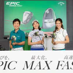 同社は、新製品のアンバサダーとして、幅広い人気を誇る女子プロゴルファー・三浦桃香を起用することを発表。そのスタートとして、タレントの関根勤と葛岡がアマチュアサポーターに就任した。記者会見に出席した関根と葛岡は、アマチュア代表として新商品の性能を証明してみせた。