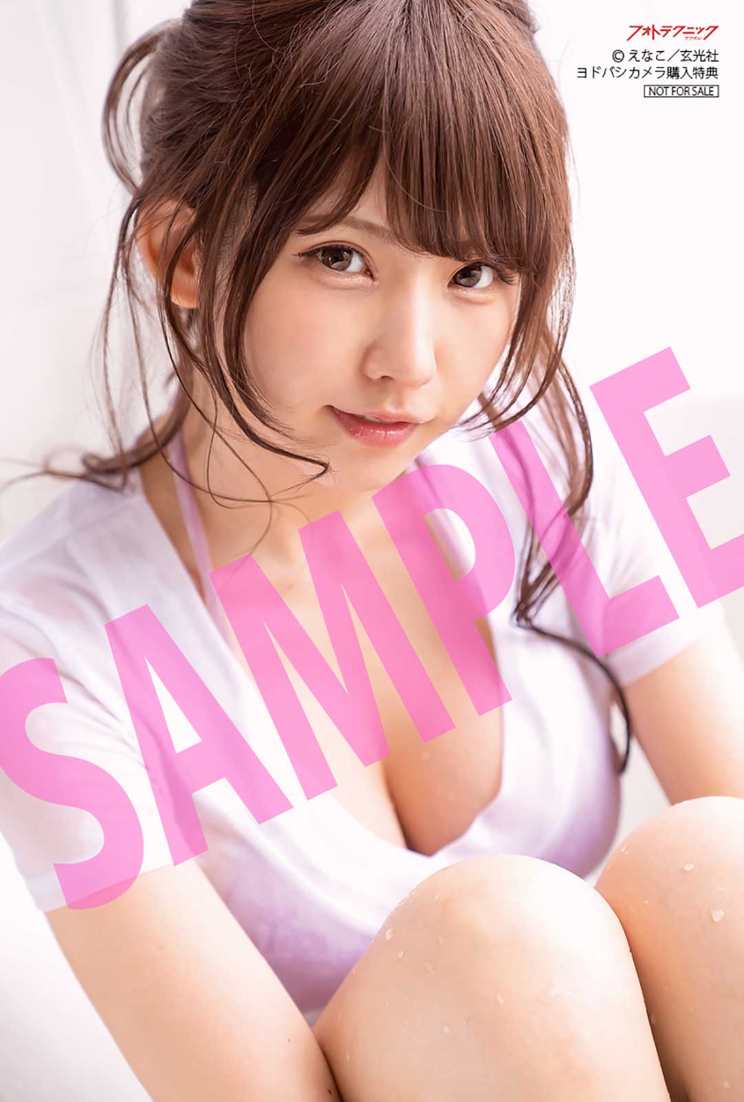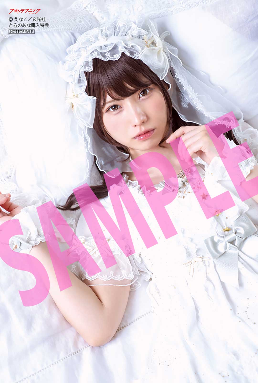 「フォトテクニックデジタル」は2005年創刊の隔月刊「デジタル・フォトテクニック」を母体として、2008年1月に月刊誌として創刊。今回の2021年8月号で最終号を迎えることとなった。フォトテクの常連であるえなこの初登場は2017年2月号。伊織もえ、篠崎こころとの3人での出演(2021年5月号)を含め、4回目の表紙出演となる。今回の衣装はウエディングドレスふうの純白ドレス、水着、私服ふうの可憐なワンピースの3パターン。撮影は写真集や雑誌グラビアを数多く手がける根本好伸氏が担当した。