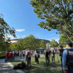 国立競技場前にある五輪マークの前には朝から多くの人が列をなし記念撮影を楽しむ姿が見られた。人の数は、ブルーインパルスが飛行した正午過ぎはもちろん、夕方を過ぎても衰えず。国立競技場自体を写真におさめようと高いフェンスに苦戦しながらカメラやスマートフォンを構える人たちも。周辺のグッズ店にも列が見られた。