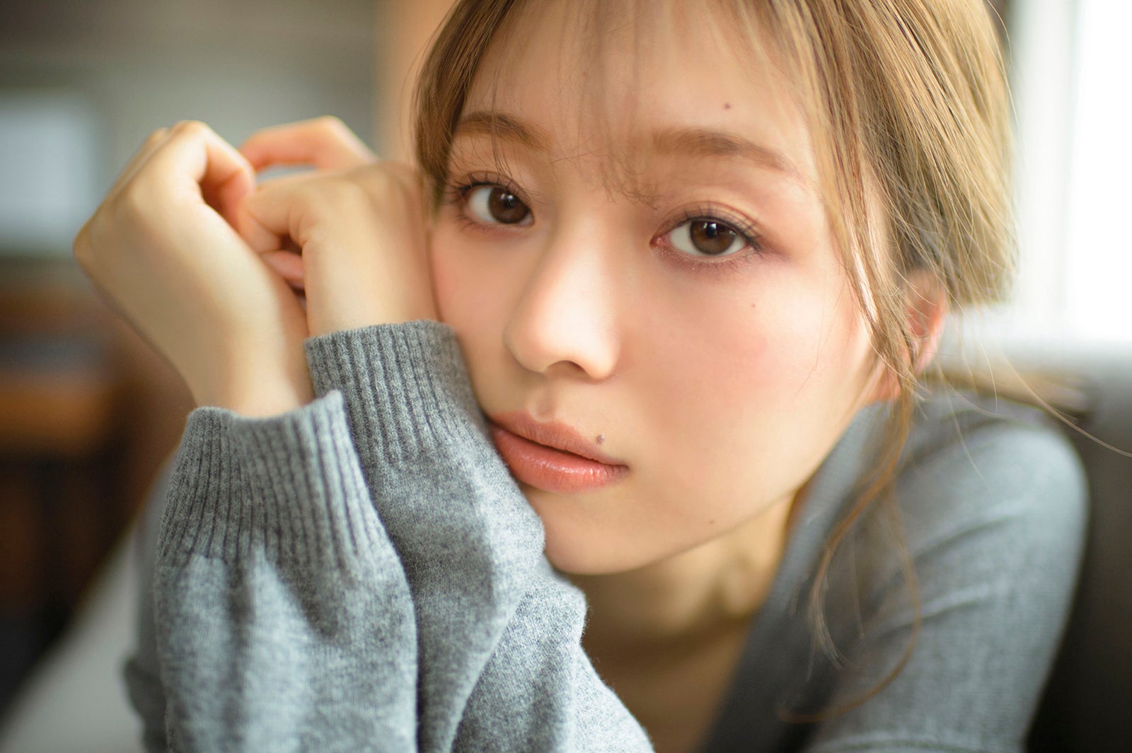 グラビアでは、透きとおるような白い肌に黄色い水着が映える寝そべりショットを披露。さらに、あざとすぎるシャツ×メガネ姿や、フェミニンな黒い水着姿、美脚の際立つルームウェア姿で誌面を彩った。