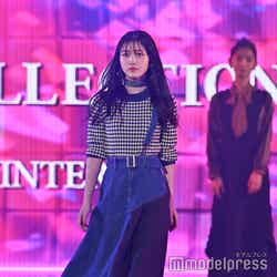先進的なGirlyと品のある色っぽさを組み合わせた次世代のネオガーリーを提案する「REDYAZEL」ステージに登場した久保は、レトロな柄物トップスとアシンメトリーデザインが特徴的なデニムスカートを着こなし。